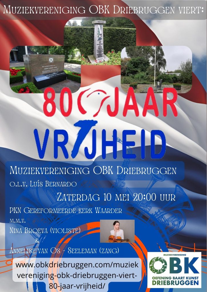 Waarder – Op zaterdag 10 mei viert Muziekvereniging Oefening Baart Kunst Driebruggen “80 jaar Vrijheid” op een spectaculaire manier! De PKN Gereformeerde kerk in Waarder vormt het decor voor een groots concert met het thema 80 jaar Vrijheid. Het orkest zal schitterende nummers ten gehore brengen, waaronder Hymne to the Fallen,