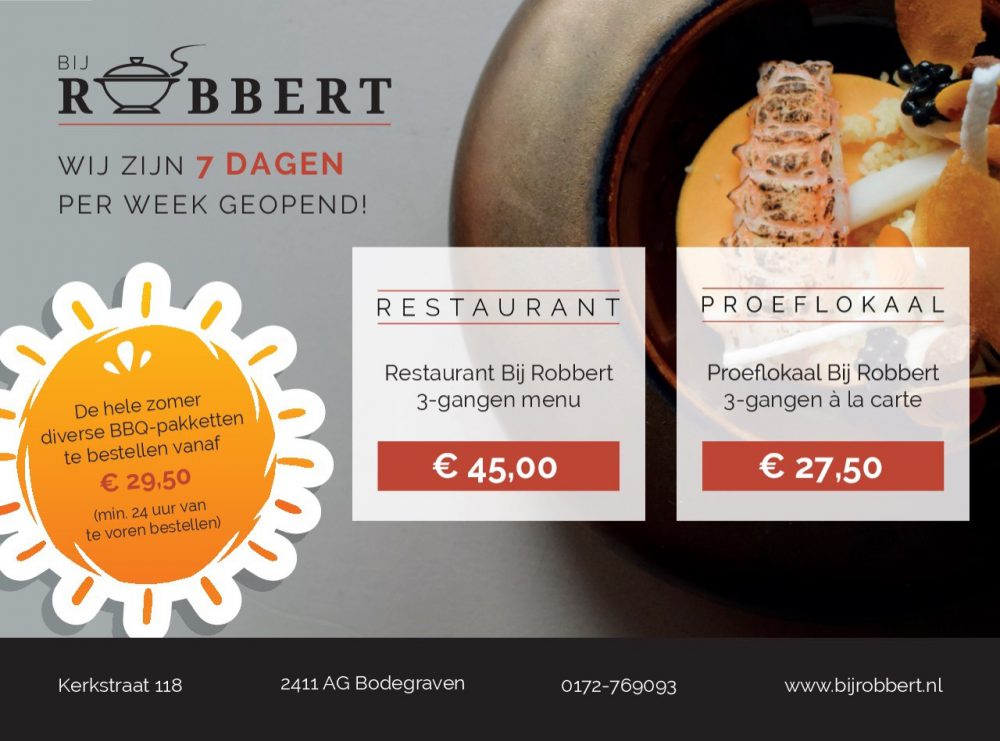 Wil je gaan genieten van het verrassingsmenu van Bij Robbert? Dan kun je reserveren via de website (vermeld dan bij de opmerking: ‘Summerdeal’) of per telefoon 0172-769093.