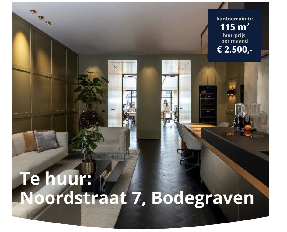 In het centrum van Bodegraven is een hoogwaardige kantoorruimte te huur aan de Noordstraat 7. De kantoorruimte heeft een oppervlakte van circa 115 m² en is volledig instapklaar. De huurprijs bedraagt € 2.500 per maand.
