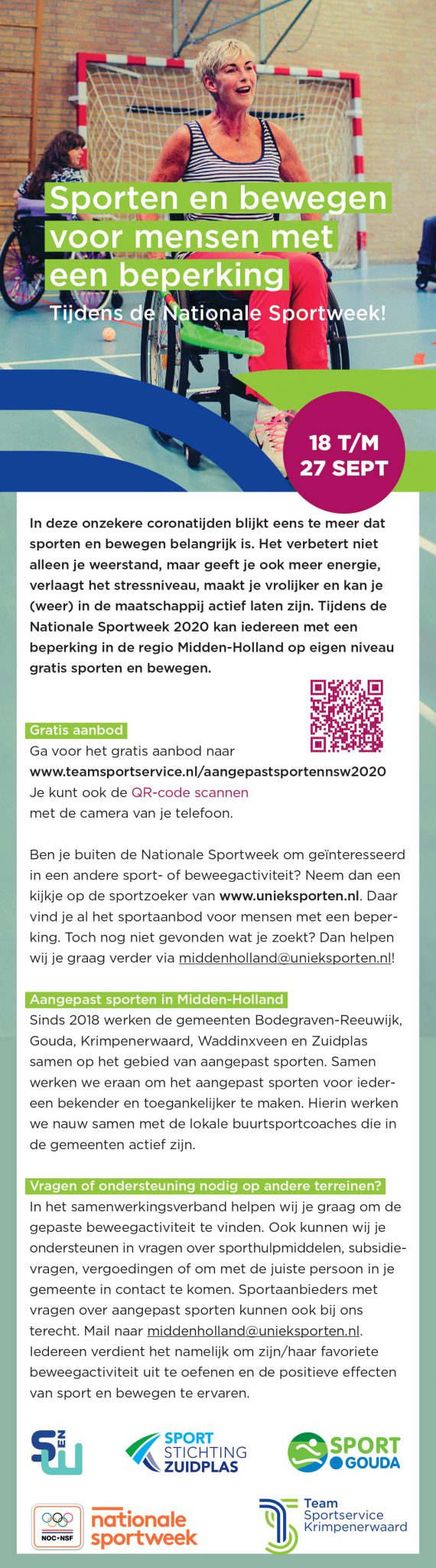 De Nationale Sportweek komt er aan, met als aandachtspunt uniek sporten! Doe mee met gratis proeflessen bij de verenigingen die aangepaste sporten aanbieden. Geef je op bij de vereniging(en) door een mail te sturen met je gegevens en een stukje over jezelf en kijk welke sport(en) jij leuk vindt!