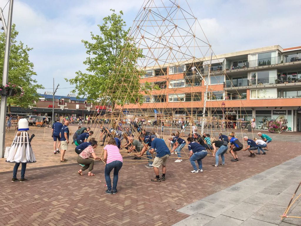 Badmintonvereniging BBS viert dit weekend het 10-jarig lustrum in Bodegraven. Het was niet te missen om het Raadhuisplein. Tientallen mensen hielpen mee om een piramide te bouwen van bamboestokken. Om 10.00 uur had de groep het voor elkaar en kwam de toren tot 17 meter hoogte.