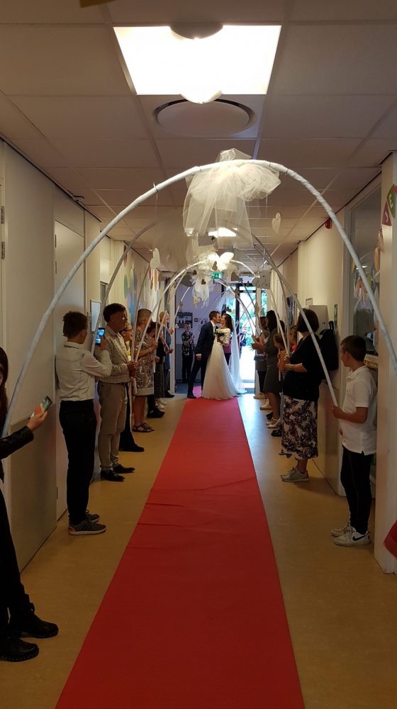 De rode loper werd uitgerold, feestkleding aan, corsages opgespeld. Juf Sarah en Henk konden rekenen op een prachtig, feestelijk onthaal. Een lookalike boeket en corsage geleverd door bloemist David Nieuwenburg maakte het feest verrassend compleet! Na de huwelijksvoltrekking door buitengewoon leerling ambtenaar Leon verklaren wij Juf Sarah en Henk tot een getrouwd paar!