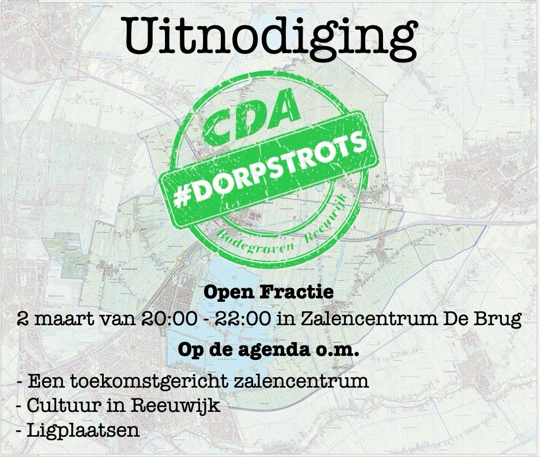 De open fractie is elke keer ergens anders in de gemeente, zo komen we naar u toe. Vanavond bent u vanaf 20.00 welkom in zalencentrum de Brug in Reeuwijk.