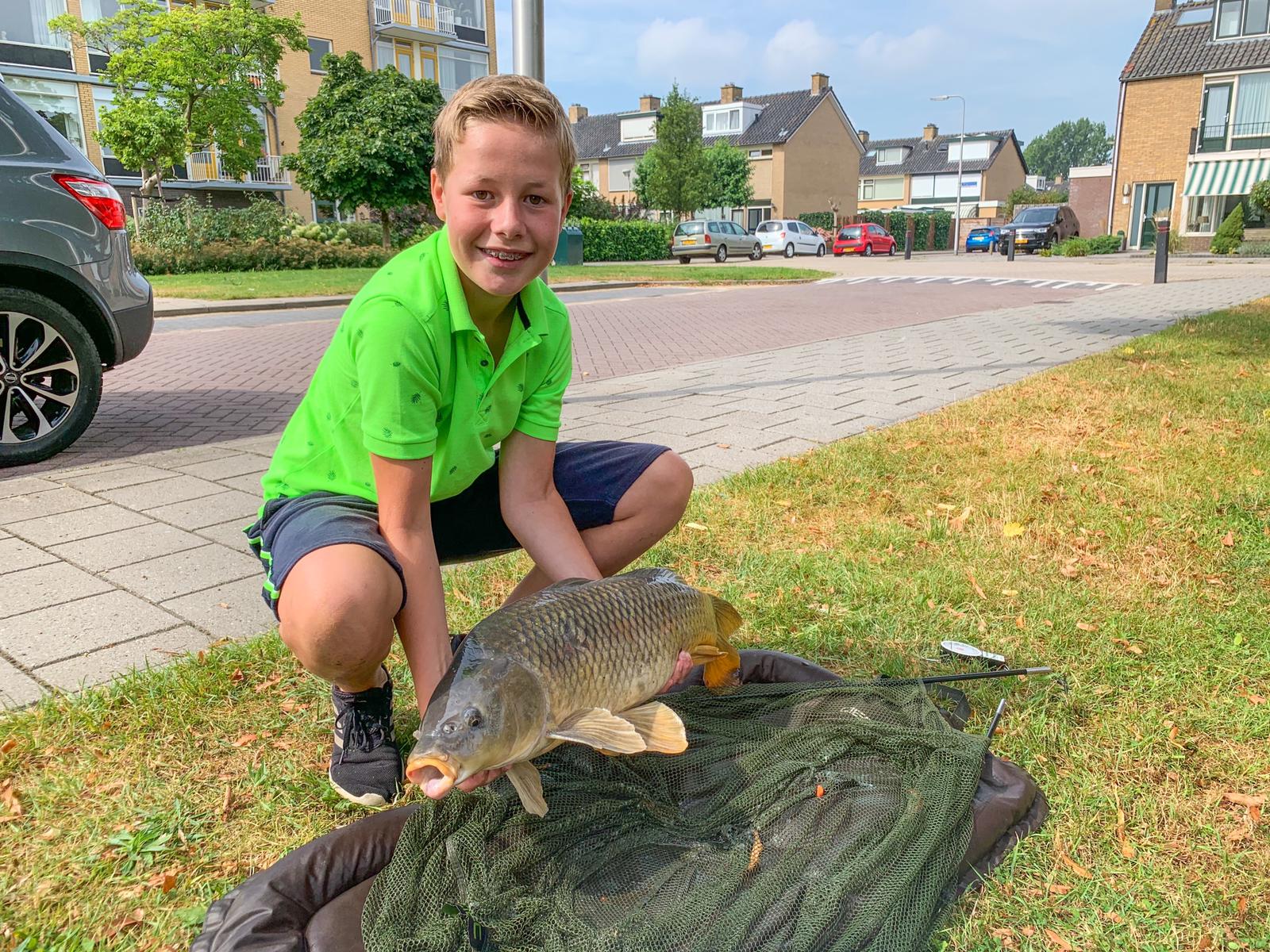 Eén ding in deze zomervakantie is duidelijk geworden: hengels helemaal thuis laten is geen optie. De 12-jarige Fabian Raaphorst en Liam Koster genieten dagelijks van het vissen in Bodegraven. Sinds de grote schoolvakantie is begonnen zijn ze dagelijks te vinden langs de waterkant in Bodegraven. Alleen Fabian is een weekje op vakantie geweest, maar verder vissen ze elke dag.