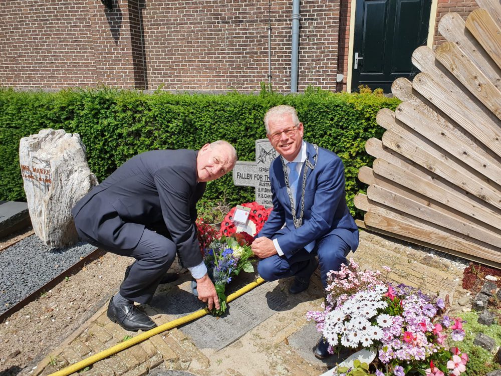 Ter gedachtenis van de omgekomen zeven bemanningsleden van de Australische Lancaster bommenwerper, die is neergestort in de Gravekoop polder, zijn vorige maand kransen gelegd bij de gedenksteen op de begraafplaats bij de kerk van Sluipwijk. Namens de gemeente is een bos bloemen geplaatst door de wethouders Dirk-Jan Knol en Odd Wagner. Het Reeuwijks 4 mei comité heeft twee kransen gelegd namens de familie Lewis voor Reginald Lewis (radiotelegrafist) en andere bemanningsleden.