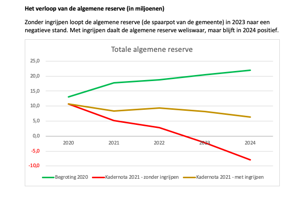 Vandaag, woensdag 1 juli, vinden de algemene beschouwingen over de Kadernota 2021-2024 plaats. De gemeenteraad buigt zich onder andere over het geschatte begrotingstekort van 800.000 euro voor komend jaar. Om dat tekort terug te dringen, zijn structurele ingrepen in de uitgaven nodig, al dan niet gecombineerd met verhoging van lokale lasten zoals een verhoging van de OZB. Financieel wethouder Dirk-Jan Knol: “Er is echt wat aan de hand. Niet voor niets heeft de Kadernota de titel ‘Alle hens aan dek’ gekregen. De situatie is urgent. We moeten samen de juiste afwegingen maken om niet in de situatie te komen dat onze leningenpositie zodanig oploopt dat we straks elk jaar extra hoge bedragen aan aflossing en rente betalen. Dat zou nog jarenlang ten koste gaan van allerlei voorzieningen.”
