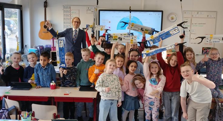 De inzet van de leerlingen bleef niet onopgemerkt. Op donderdag 5 maart kreeg groep 4b bezoek van wethouder Kersbergen. Tot grote verrassing van de kinderen kwam hij niet met lege handen: hij bracht een hele stapel afvalgrijpers mee. En daar bleef het niet bij. Als extra verrassing had hij ook een gezonde traktatie meegenomen: een doos met heerlijke mandarijnen.