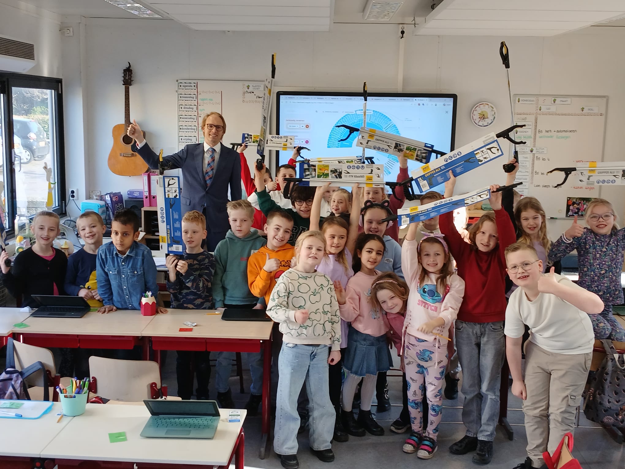 De inzet van de leerlingen bleef niet onopgemerkt. Op donderdag 5 maart kreeg groep 4b bezoek van wethouder Kersbergen. Tot grote verrassing van de kinderen kwam hij niet met lege handen: hij bracht een hele stapel afvalgrijpers mee. En daar bleef het niet bij. Als extra verrassing had hij ook een gezonde traktatie meegenomen: een doos met heerlijke mandarijnen.