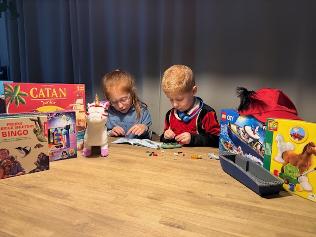 “Wat waren Zoë en Jason toch verbaasd en overrompeld! Maar o zo dankbaar voor al het moois. Thuis wilden ze meteen met alles spelen. De Lego is een groot succes, want ze gingen er gelijk mee aan de slag. De boot staat al bijna in elkaar! Hierbij ook de beloofde foto van het bouwen.”