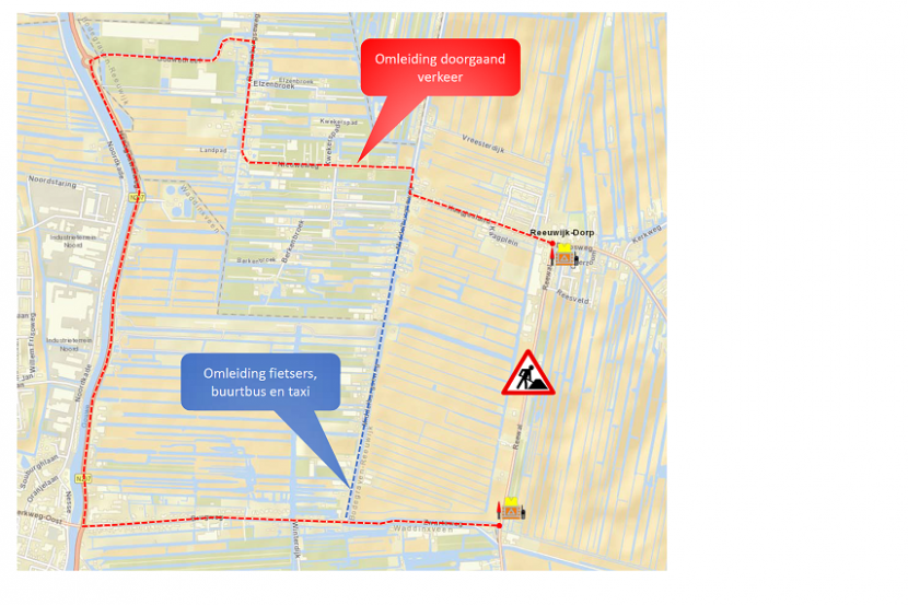 Gedurende de werkzaamheden is voor het doorgaande verkeer een omleiding van kracht via Kaagjesland, de N207 (Henegouwerweg) en de Zwarteweg. Uitgezonderd zijn bewoners aan de Reewal en vrachtverkeer die op aanwijzing van verkeersregelaars worden doorgelaten. Voor fietsers, de buurtbus en taxi’s geldt een verkorte omleiding over de Middelburgseweg.