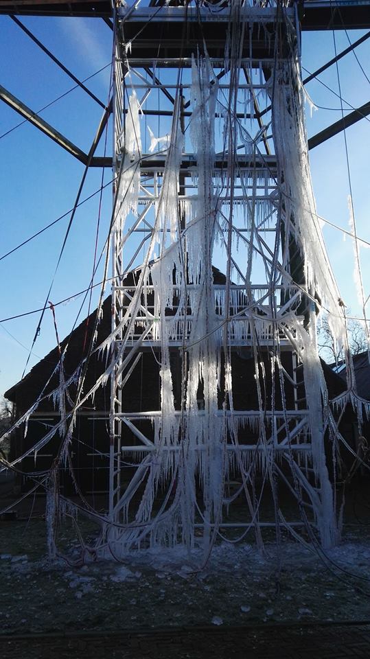 Martine Knoope laat weten dat de opbouw bijzonder in elkaar steekt. “We hebben een steiger opgebouwd en deze daarna vastgemaakt aan de kap van de hooiberg met touwen, zodat we de muur zo mogelijk kunnen maken. Dan hebben we een klimtouw over de breedte gespannen, kleine touwtjes daaraan vastgeknoopt en die vallen naar beneden. Vervolgens gaat de tuinslang aan, en dan gaat het water van bovenaf naar beneden, langs het touw. Af en toe moet je de slang een beetje verhangen dat het water weer net anders langs het touw loopt. Hierdoor ontstaat een bevroren waterval. Dit heeft mijn vader Thomas Knoope zelf bedacht.”