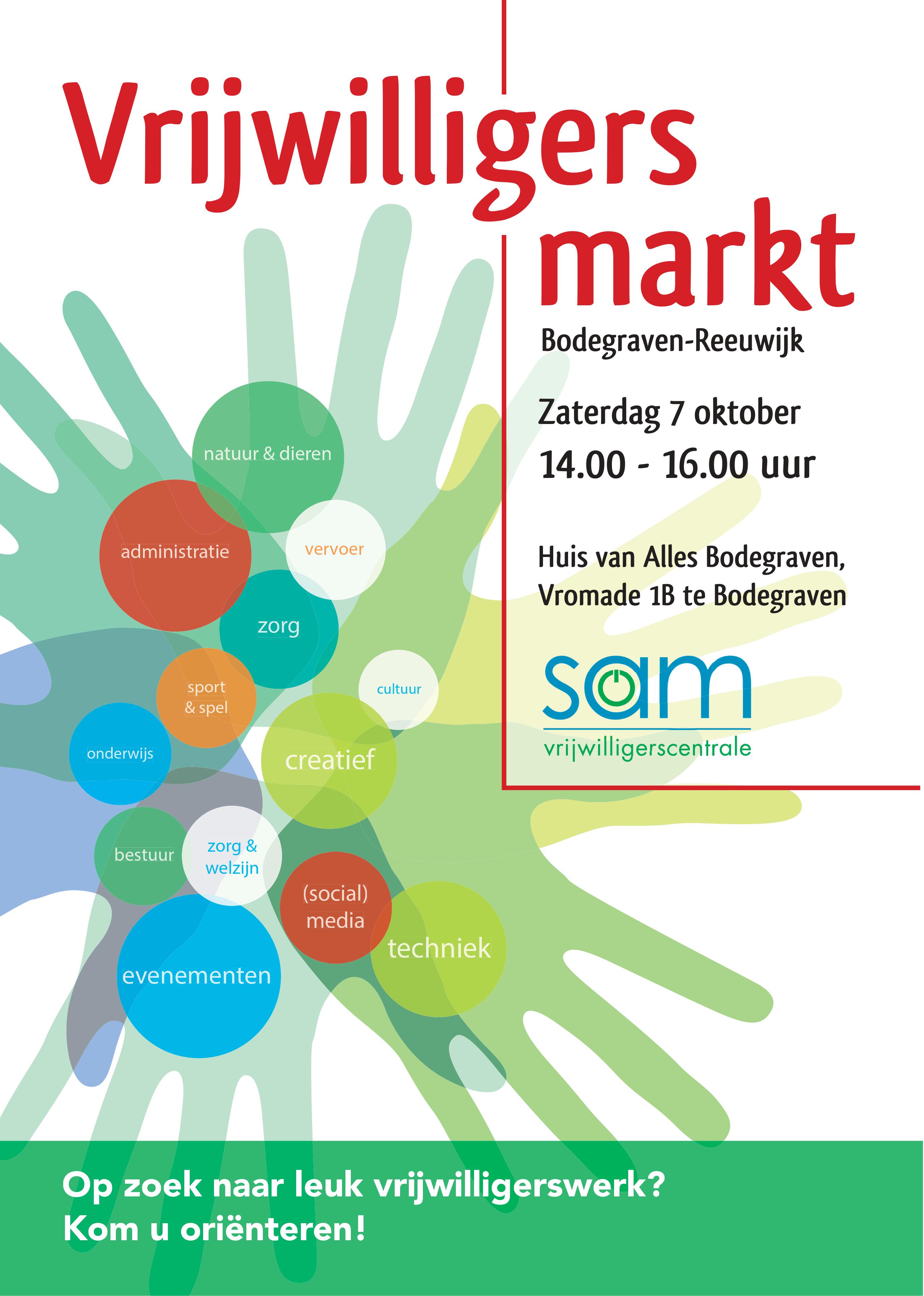 Op zaterdag 7 oktober organiseert de Vrijwilligerscentrale van SAM tussen 14:00 en 16:00 uur de Vrijwilligersmarkt in het Huis van Alles Bodegraven. Vrijwilligersorganisaties uit de gemeente Bodegraven-Reeuwijk kunnen zich vanaf nu aanmelden voor een plek op de Vrijwilligersmarkt.