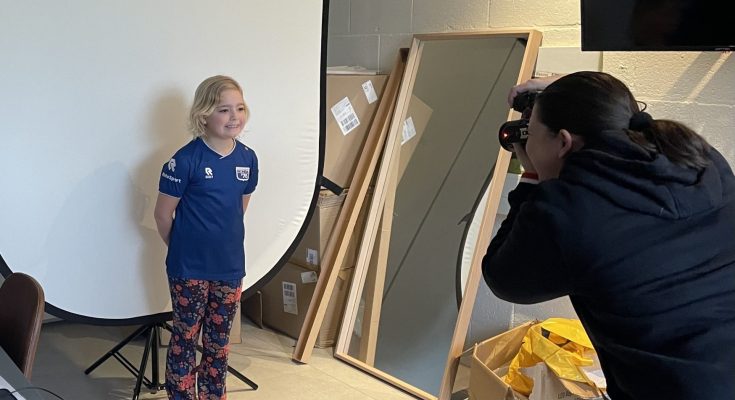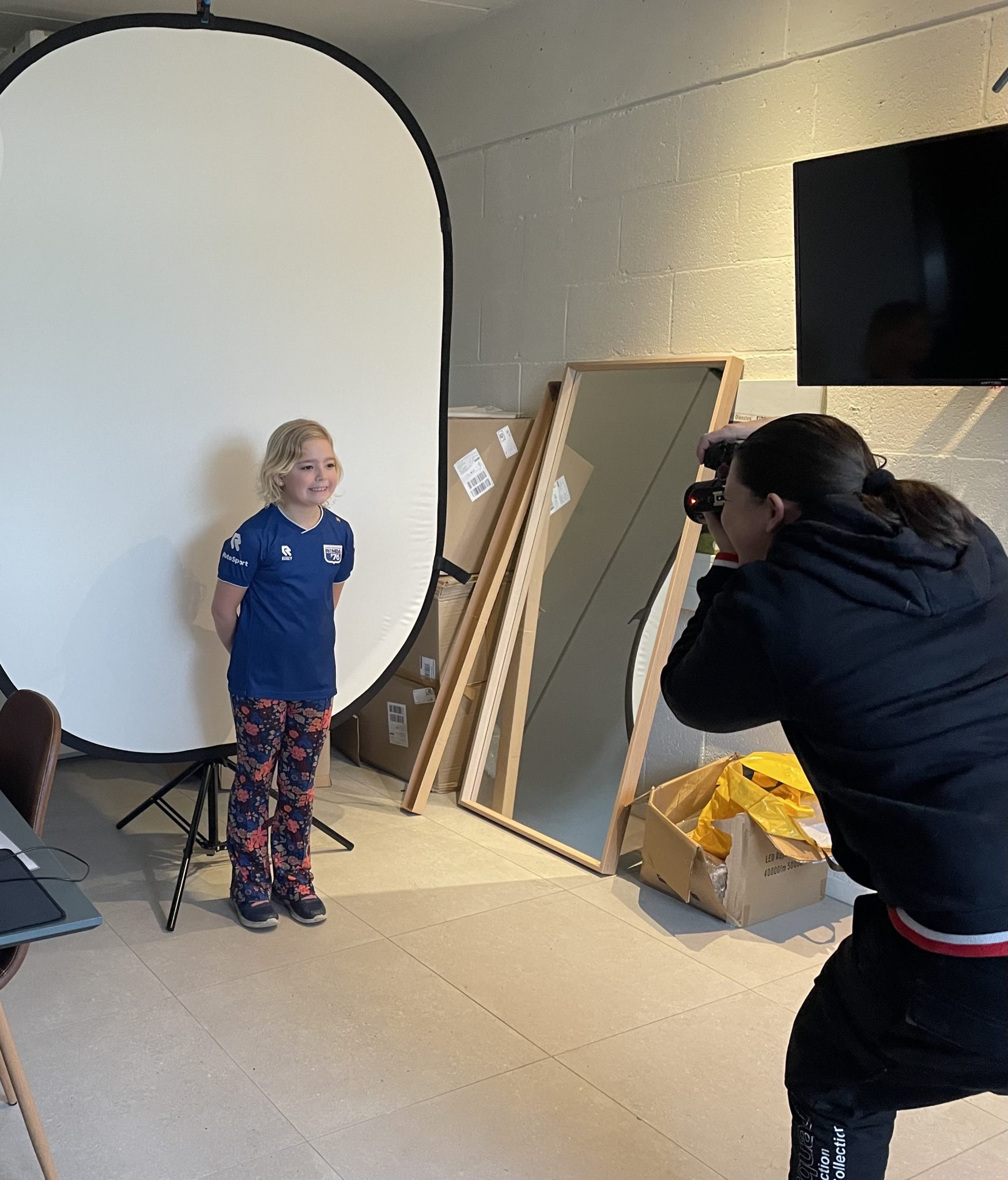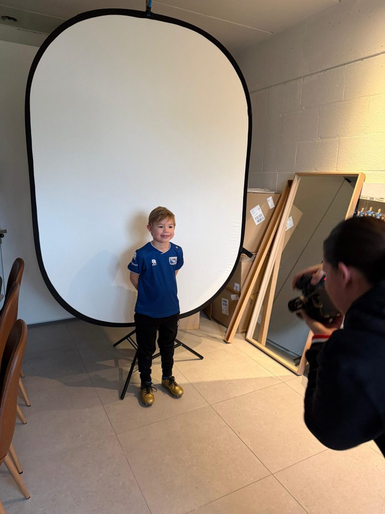 Jennifer, de fotografe van dienst, had behalve haar camera ook een witte backdrop en enkele ‘belichtingsparaplu’s’ meegenomen om iedereen zo scherp mogelijk in haar lens te vangen. ,,Even lachen en je handen op je rug,” coachte ze de in- en uitlopende blauwhemden. Klik, klik, klik. ,,Goed gedaan hoor,” voegde ze nog toe als de geportretteerde speler of speelster de ‘studio’ in de kantine weer verliet. Komende zaterdag mogen de andere ongeveer 300 spelende leden zich laten vereeuwigen.