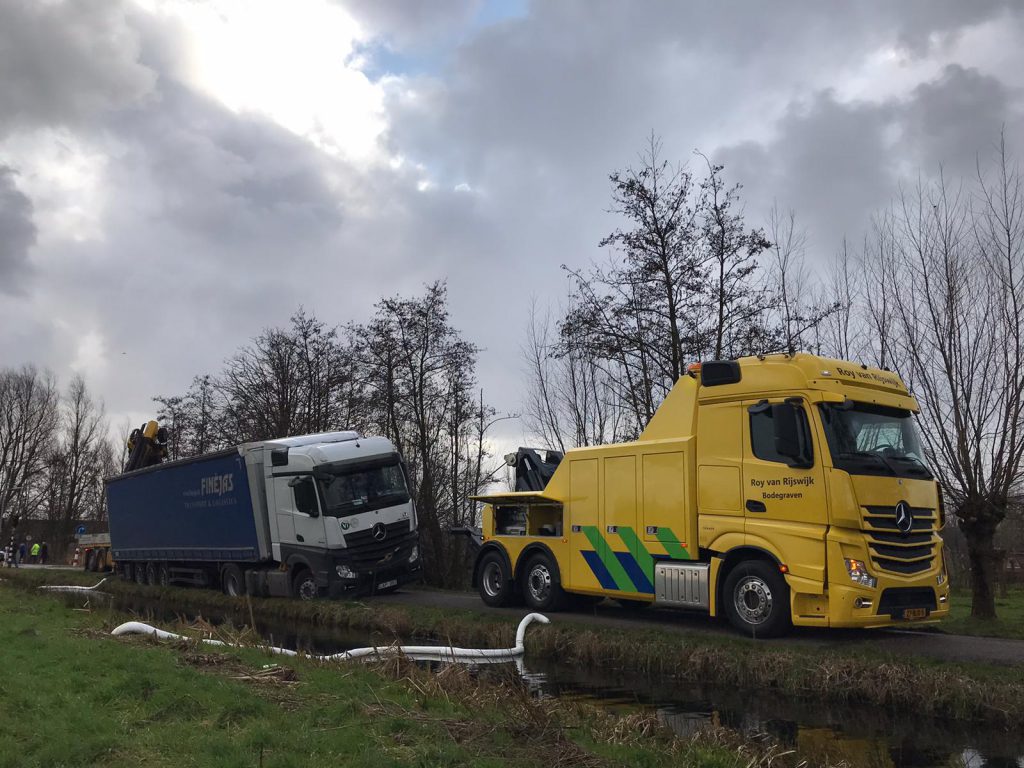 Het Bodegraafse bergingsbedrijf Roy van Rijswijk mocht het klusje klaren. Samen met Modern hebben ze vrachtwagen rond 16.30 uur weer op de weg kunnen krijgen.