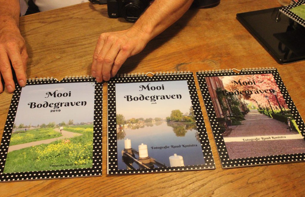 “Het idee om een kalender te maken van alle foto’s kwam omdat ik op een gegeven moment zo veel foto’s had, en dacht: misschien willen mensen ze wel aan de muur hebben. Ik had er zo veel. Toen was het zoeken welke de mooiste waren.”“Het is nog een heel werk om de juiste foto’s te selecteren”, zegt Kooistra, terwijl hij de kalenders laat zien. Voor hem liggen de kalenders, waaronder de nieuwste voor 2019. Het zijn veel verschillende foto’s met voor iedere Bodegraver herkenbare plaatsen in Bodegraven.