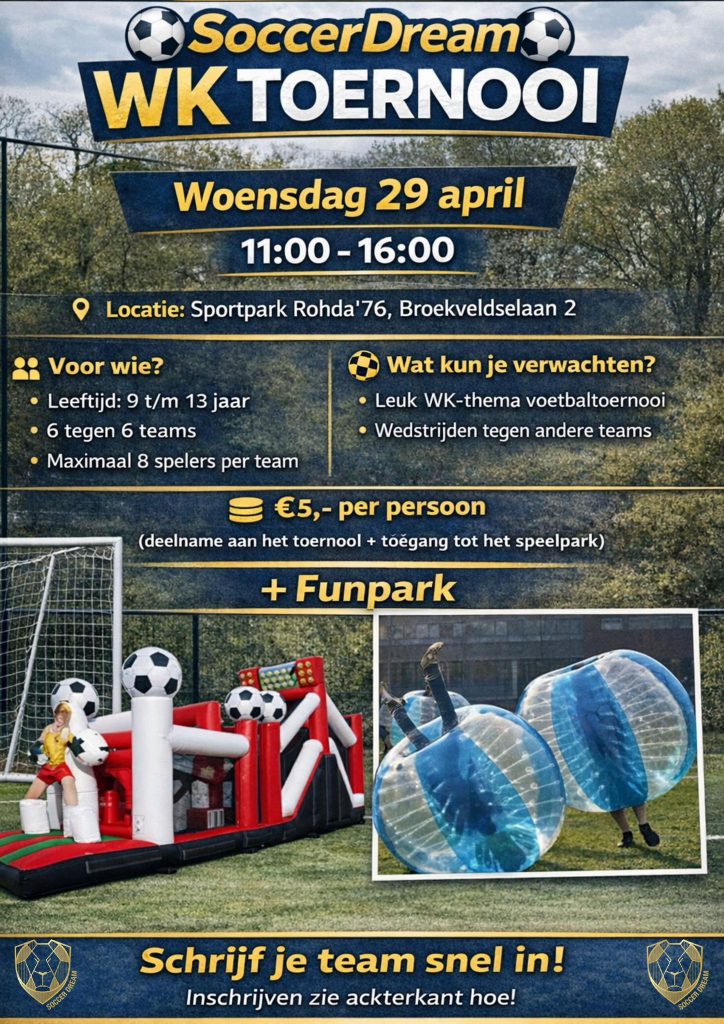 Zin om mee te doen? Schrijf je team snel in! mail naar: Info@soccerdream.nl