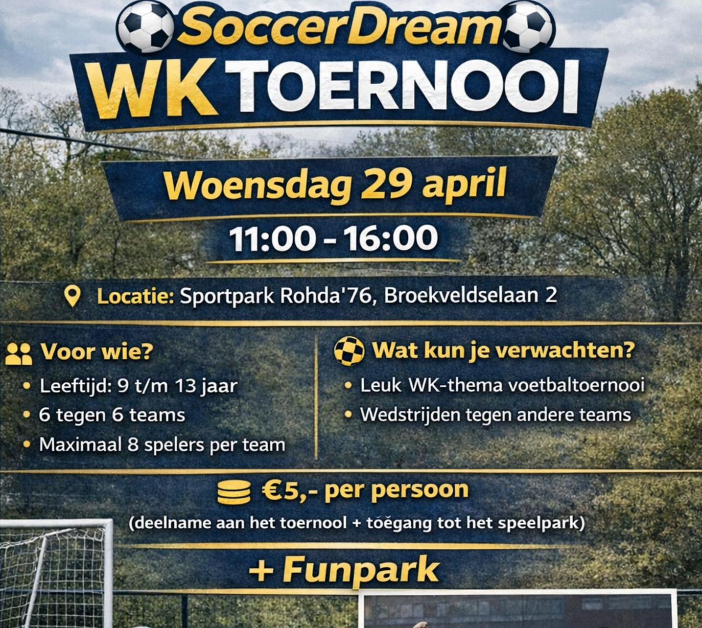 👉 Inclusief: deelname toernooi, wedstrijdshirt én toegang tot het mega funpark! 🎉