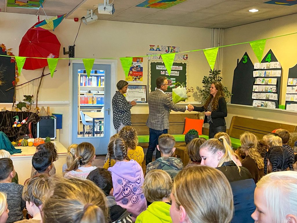 Donderdag 20 oktober is de nieuwe bibliotheek op basisschool de Brug in Nieuwerbrug feestelijk geopend. Mevr. de Vries, wethouder in de gemeente Bodegraven-Reeuwijk, verzorgde samen met de oudste en jongste leerlingen van de school de officiële opening.