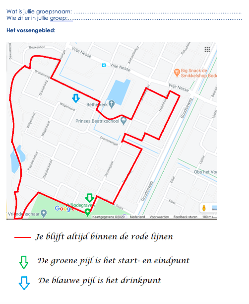 Er moesten wel 11 vossen gevonden worden in een deel van het dorp Bodegraven. Dat ging niet zo gemakkelijk, sommige vossen waren sluw en doken op tijd weg en waren niet meer te vinden. Bij één vos kregen ze drinken en lekkers. Als de vos “gevangen” was moest die een letter afgeven. Aan het eind kon elke groep een zin maken en bij inleveren kregen ze allemaal wat lekkers mee naar huis. Iedereen een fijne zomervakantie!