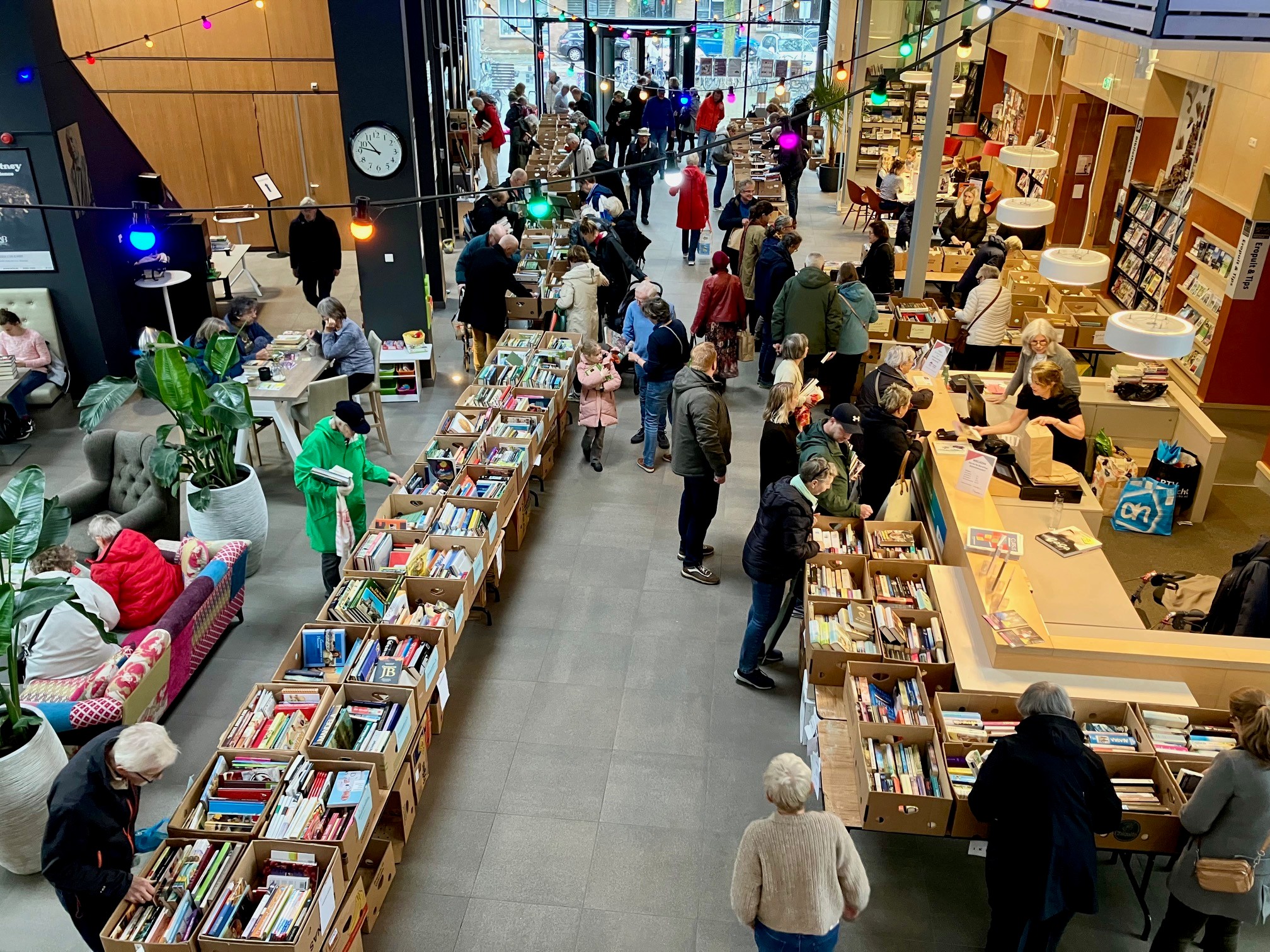 Mensen kwamen niet alleen voor de boeken, maar namen ook de tijd om onder het genot van een kop koffie en door vrijwilligers gebakken taart even gezellig te kletsen. Ook voor het boekvouwen met Hannah bij de bibliotheek was leuke belangstelling. De mooie opbrengst van €1600,- wordt gebruikt voor theaterkaartjes voor minderbedeelde kinderen.