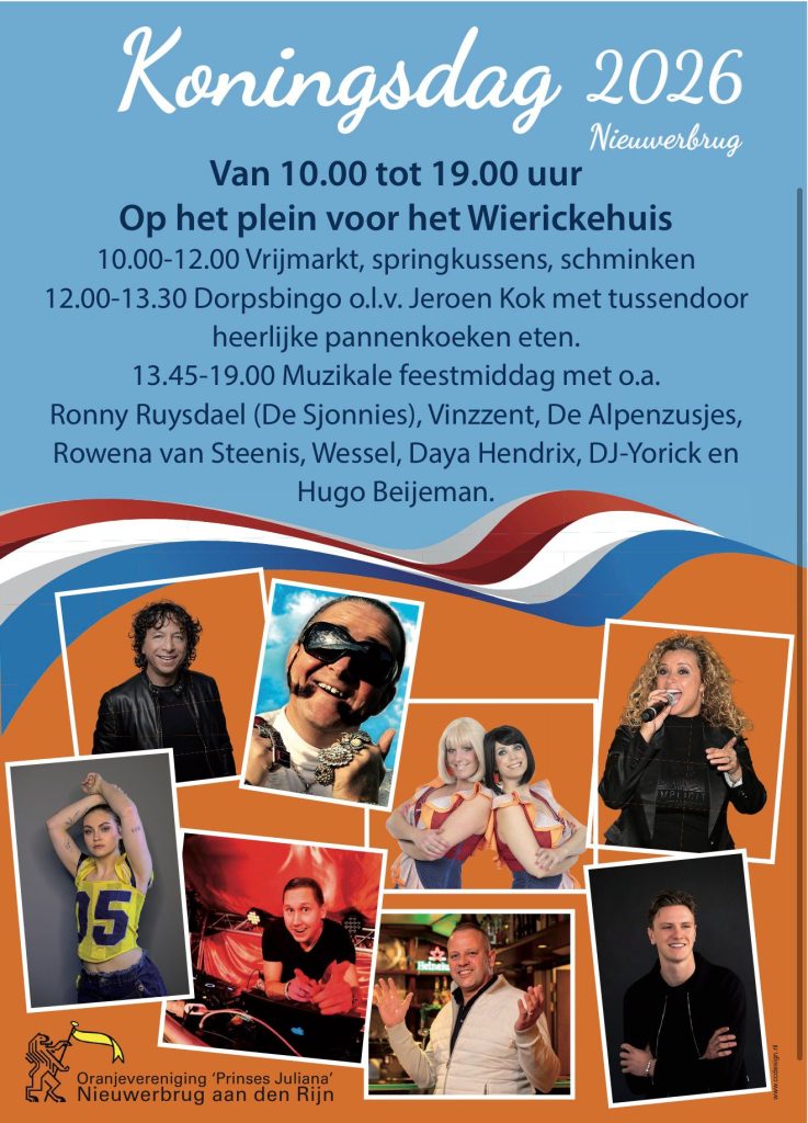 Maandag 27 april vieren we Koningsdag in Nieuwerbrug. Alle activiteiten worden gehouden op of bij het plein voor het Wierickehuis van 10:00 tot 19:00 uur. Alles kan contant of met pin betaald worden deze dag!