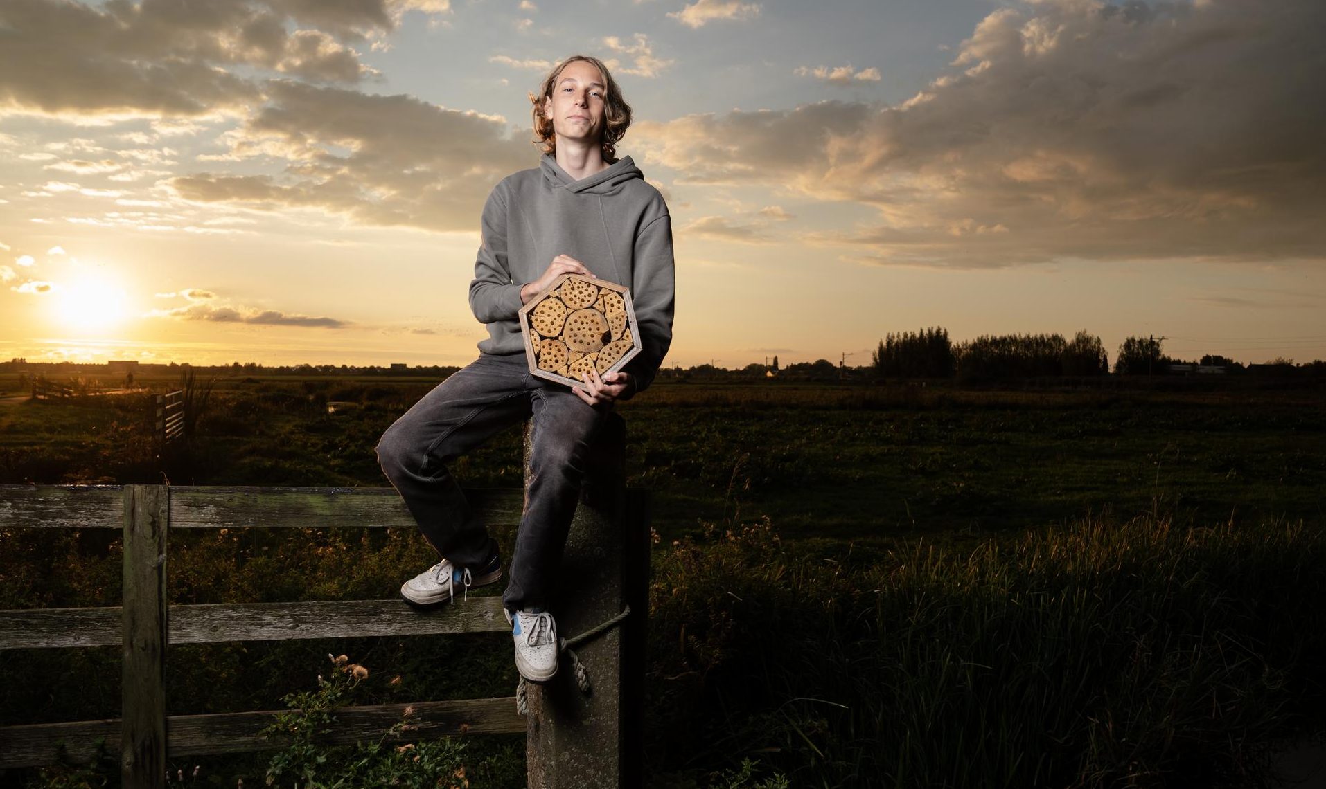 De jonge Bodegraver maakt van gebruikt hout en natuurlijke materialen bijenhotels. Door ze te verkopen via een biologische kruidenkweker draagt hij bij aan het behoud van de wilde bij én het hergebruik van materialen.