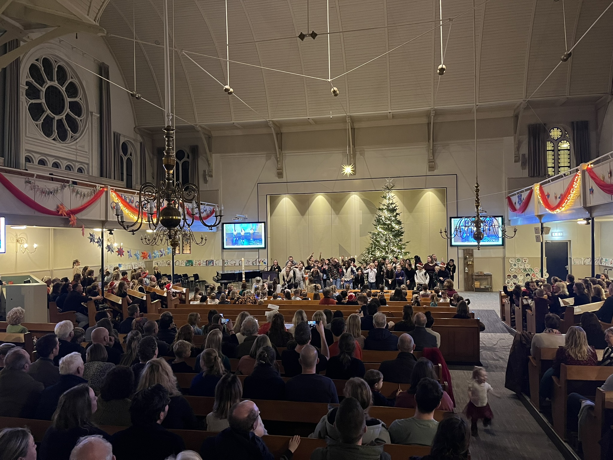 De kerk was mooi versierd met verschillende werkstukken van de kinderen en wat zat de kerk vol. We kijken terug op een mooie kerstviering met elkaar.