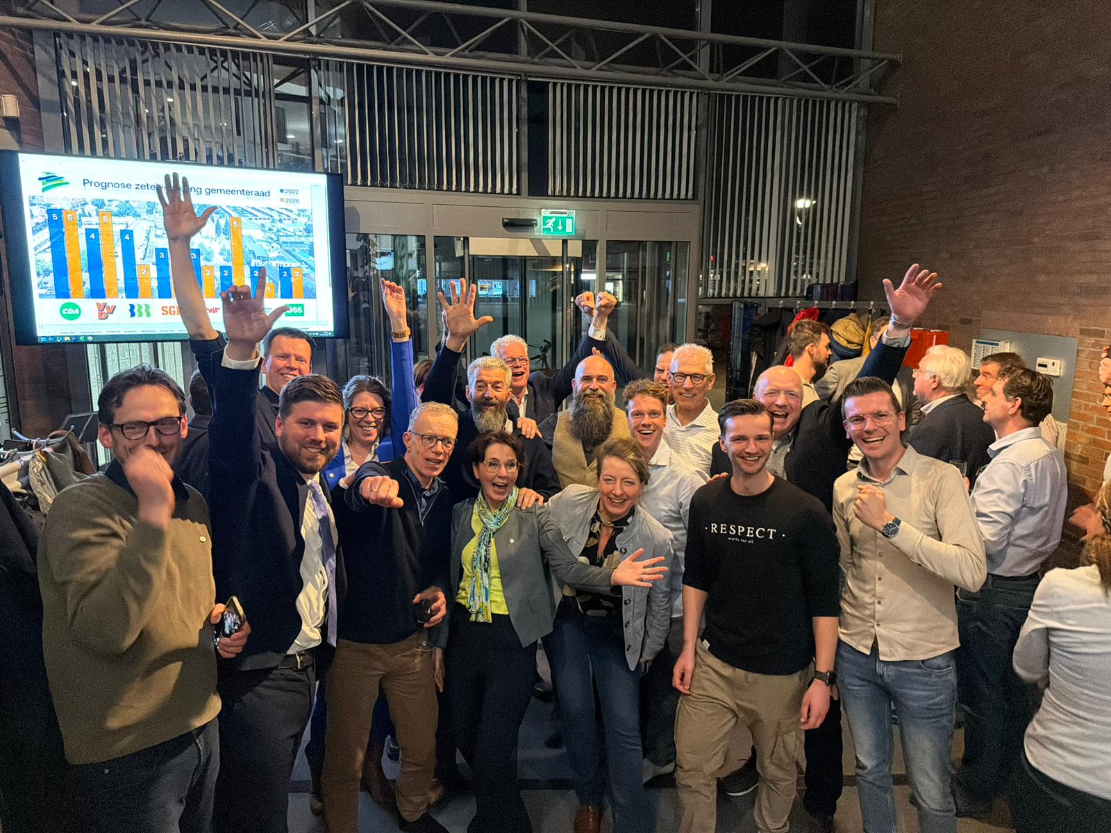 Een gemoedelijke maar licht gespannen sfeer in de foyer van het gemeentehuis: lokale partijen wachten de uitslagen samen af. Straks zullen de eerste uitslagen bekend worden gemaakt door de burgemeester.
