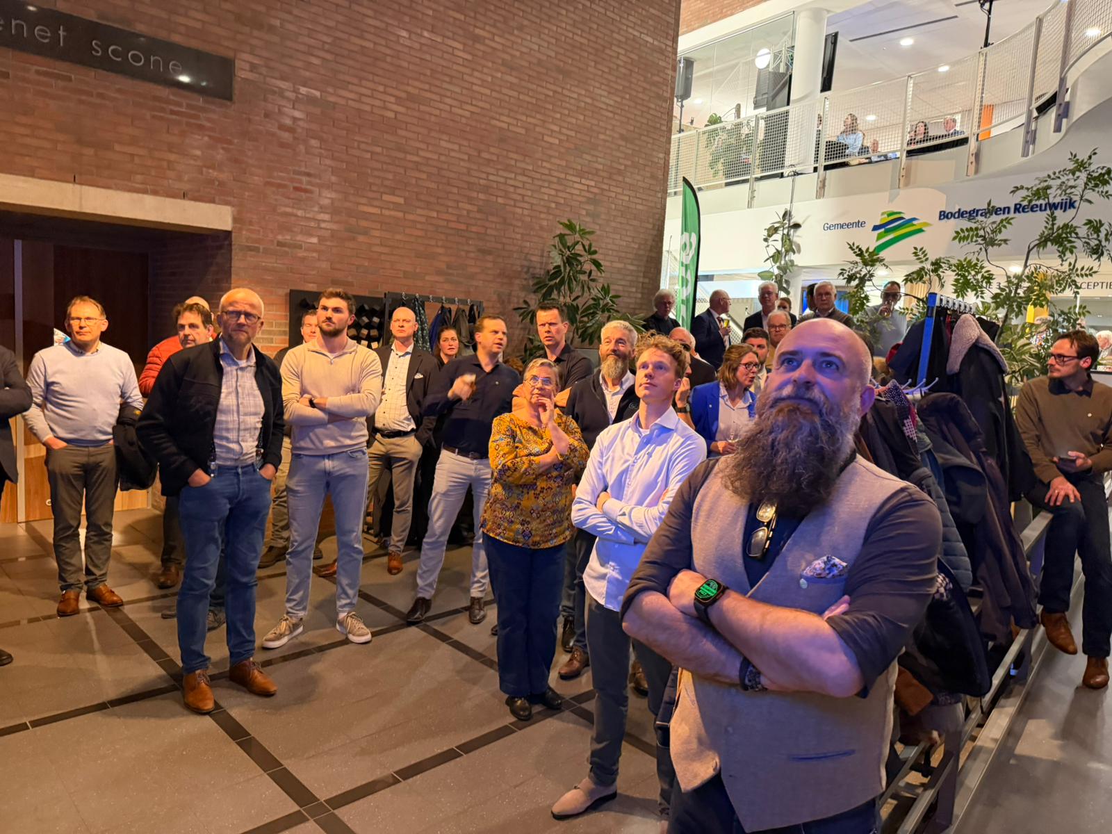 Een gemoedelijke maar licht gespannen sfeer in de foyer van het gemeentehuis: lokale partijen wachten de uitslagen samen af. Straks zullen de eerste uitslagen bekend worden gemaakt door de burgemeester.