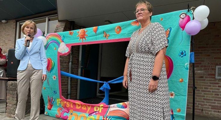 Na een welkom door onze directeur Joke Pater, werd het schooljaar officieel geopend door Diana Lorier, de voorzitter van onze stichting. Aan alle groepen werd een boek als cadeau uitgereikt waarna de leerkracht(en) en de leerlingen per groep onze tijdelijke school aan de Julianastraat 40-42 instapten. Ook de ouders mochten even mee naar binnen om het ingerichte klaslokaal te zien.