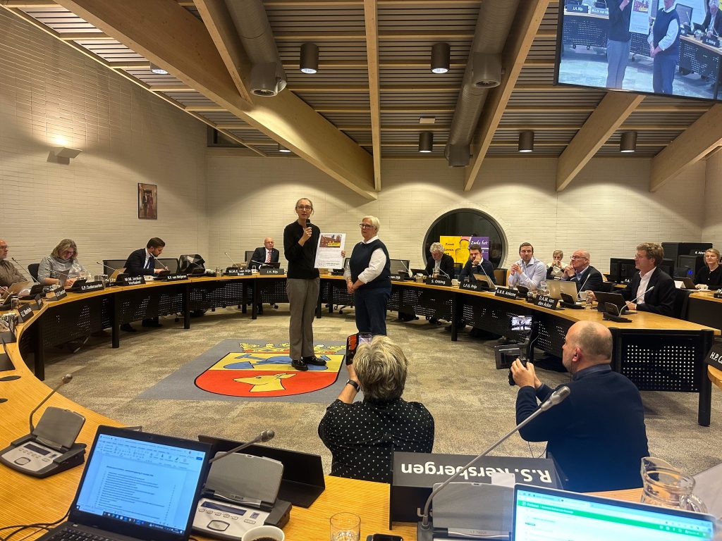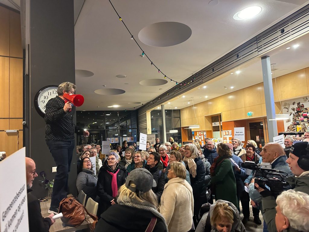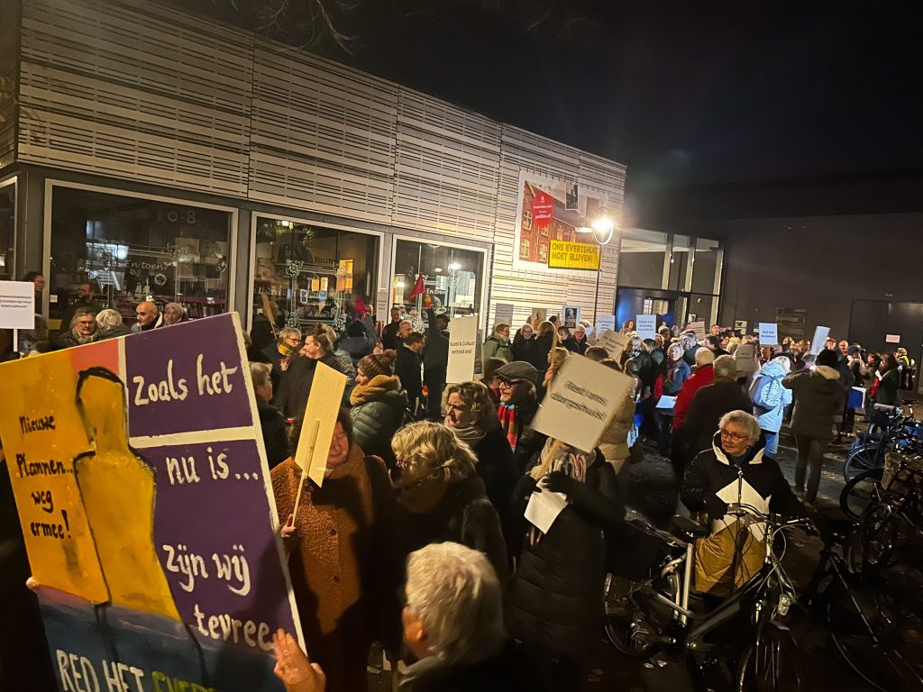Een bijzondere avond in Bodegraven: rond 19.00 uur verzamelden ongeveer 200 mensen zich in het Evertshuis voor een protestmars tegen de mogelijke verkoop van het historische deel van het gebouw, de Turkenburg. Onder begeleiding van een orkest zongen de demonstranten een speciaal gemaakt lied. Vervolgens trok de stoet met borden en luid protest naar het gemeentehuis, waar de sfeer niet minder levendig werd. In de gang wachtten de demonstranten, terwijl zij zingend de binnenkomende gemeenteraadsleden begroetten. ‘EVERTSHUIS! ONS HUIS’ hoorde je regelmatig in de gang.