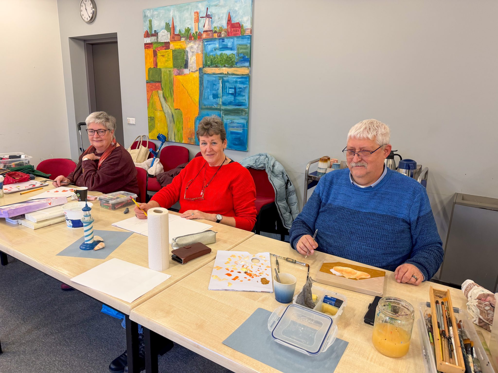 De schilderlessen worden eens in de twee weken gegeven en staan onder leiding van Marianne van Dedem uit Bodegraven. Voor veel deelnemers is het een vast moment in de agenda, zeker nu sommigen met pensioen zijn. “Je hebt iets om naar uit te kijken en je blijft creatief bezig,” klinkt het aan tafel.