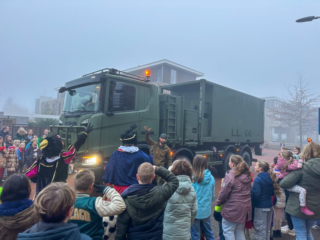 In nood bel je het leger en dat deden ze dan ook. Even later reed een imposant groen legervoertuig naar de school toe. De chauffeur stapte uit, overhandigde de sleutel en verklaarde het mysterie opgelost. Maar de grootste verrassing moest nog komen. Achterin het voertuig bleek niemand minder dan Sinterklaas zelf te zitten. Onder luid gejuich kwam hij naar buiten en begroette vrolijk alle kinderen, leerkrachten en directrice Tessa Hermans.