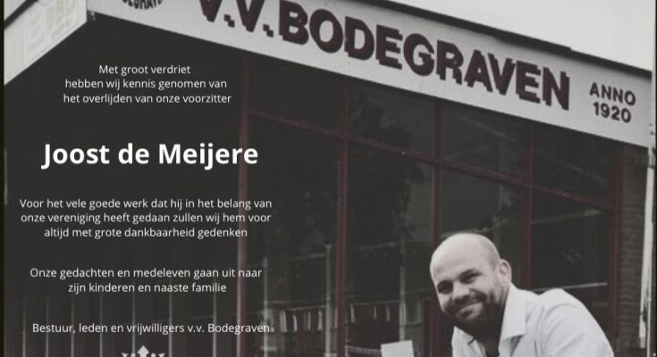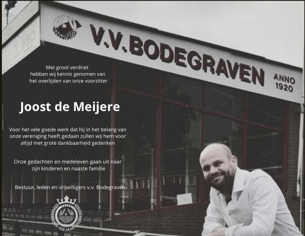 Voetbalvereniging Bodegraven heeft met groot verdriet bekendgemaakt dat hun voorzitter, Joost de Meijere, maandag 29 september 2025 op 43-jarige leeftijd is overleden. Joost was vanaf zijn jeugd betrokken bij de club en speelde jarenlang in het eerste elftal. Sinds 2020 vervulde hij de rol van voorzitter. Daarbij zette hij zich met volle energie in voor de vereniging, onder andere in het traject rondom de aanstaande verhuizing van vv Bodegraven van de Groene Zoom naar een nieuwe locatie.