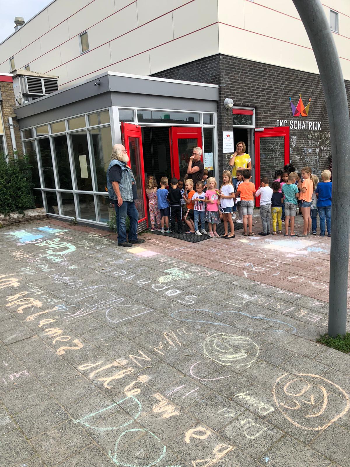 Vandaag nam groep 8 van basisschool IKC Schatrijk afscheid. Alle kinderen maakten een mooie krijttekening op het plein en kregen een bellenblaas.