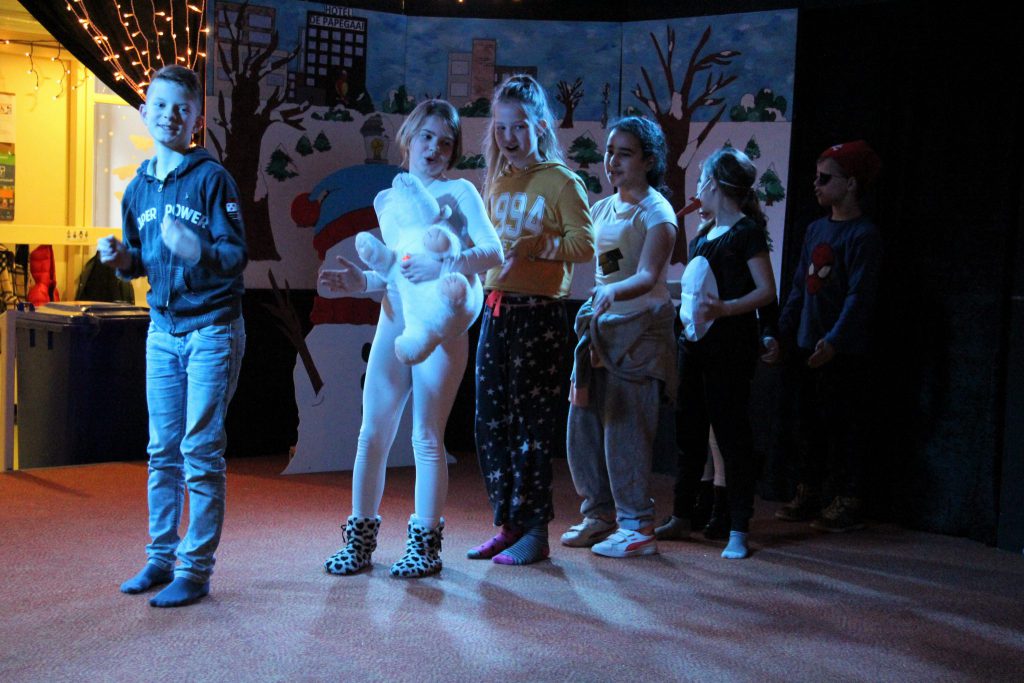 De Nationale Voorleesdagen werden afgelopen vrijdag feestelijk afgesloten op ’t Vogelnest. De leerlingenraad had de leerlingen gevraagd om in pyjama naar school te komen en verraste hen ’s ochtends met een optreden. Het verhaal van Tim en de Tjoeketjoektrein van Harmen van Straaten werd voorgelezen én uitgebeeld. Tim nam een koe, pinguïns, giraffe, een chagrijnige ijsbeer en een piraat in zijn denkbeeldige tjoeketjoektrein mee naar sprookjesland. Het verhaal was niet alleen heel leuk om naar te kijken, het sprak ook tot de verbeelding en dat was precies de bedoeling. Wat is er leuker dan wegdromen in een boek?