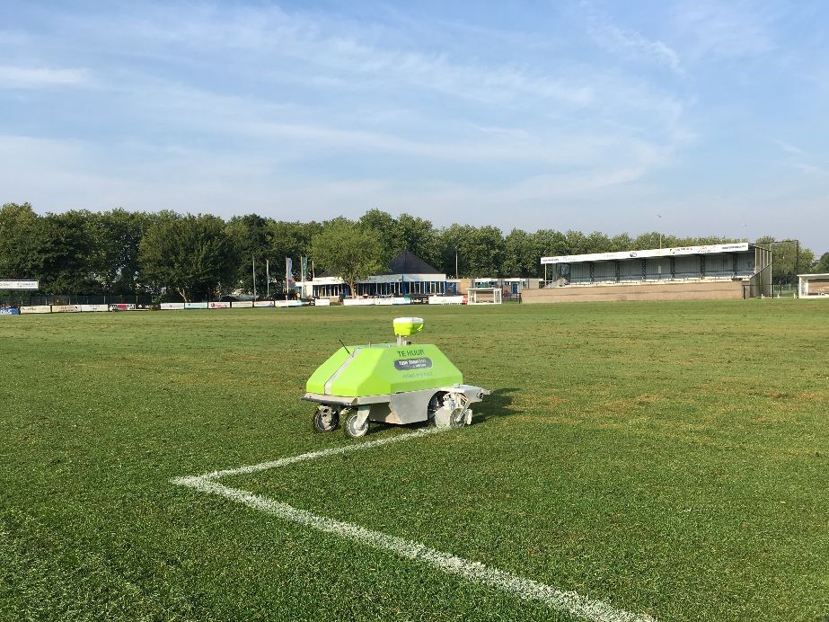 Foto-onderschrift: de robort kalkt de lijnen kaarsrecht op het veld. Foto’s Ad van den Herik