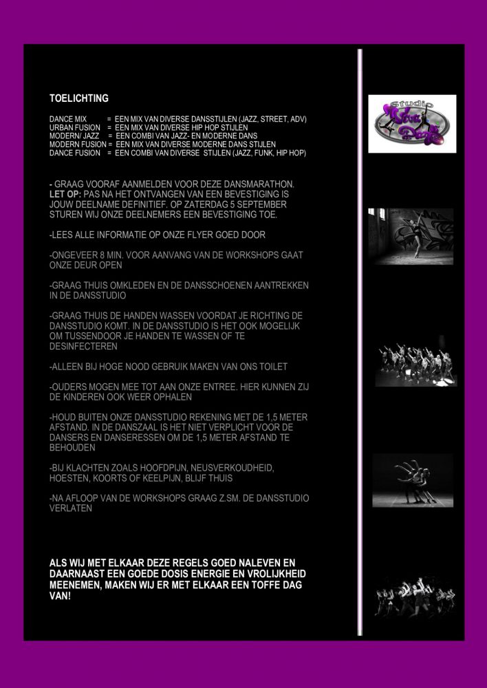 Studio Viva Dans opent 7 september a.s. weer haar deuren. Om het seizoen feestelijk te openen organiseren zij zondag 6 september een dansmarathon met diverse toffe workshops die gratis te volgen zijn voor leden EN niet leden. Je hoeft dus geen lid te zijn bij Studio Viva Dans, om toch lekker mee te kunnen dansen. Het docenten team van maar liefst 6 docenten bied diverse workshops aan vanaf 4 jaar t/m (jong) volwassenen. Diverse stijlen zoals Jazz Dans, Modern en streetdance/ Hip Hop komen aan bod. De tijden en stijlen zijn terug te vinden op de flyer.