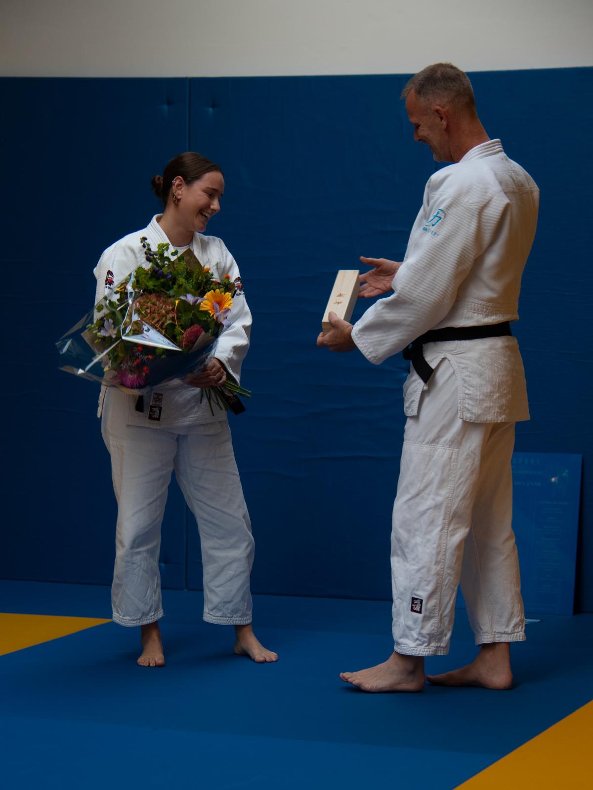 Foto 1: Indy krijgt van haar trainer Eric Zwaan de zijden judoband met naam overhandigd