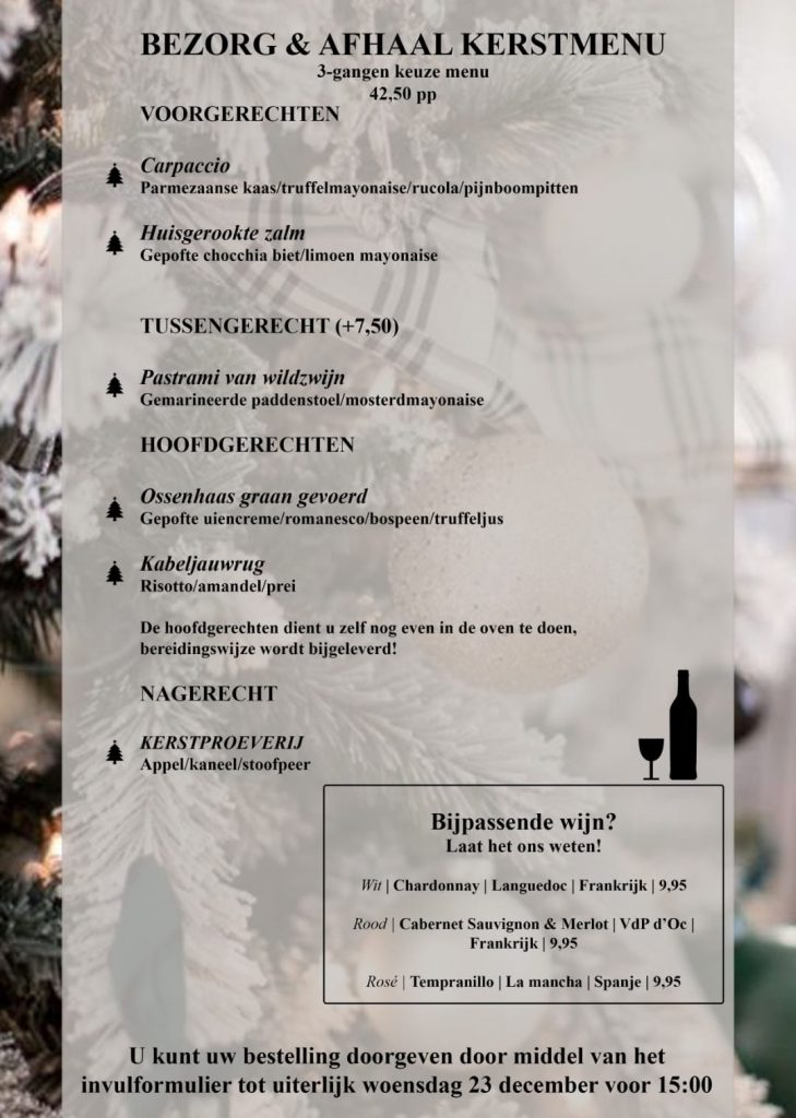 Ons kerstmenu bestaat uit een 3 gangen keuze menu voor 42,50 per persoon. Je kunt ook een bijpassende wijn bijbestellen met keuze uit: rood, wit of rosé. Bestellen kan via een invullijst op onze website die doorgemaild kan worden naar onze email. Bestellen doorgeven tot uiterlijk woensdag 23 december voor 15:00 uur.